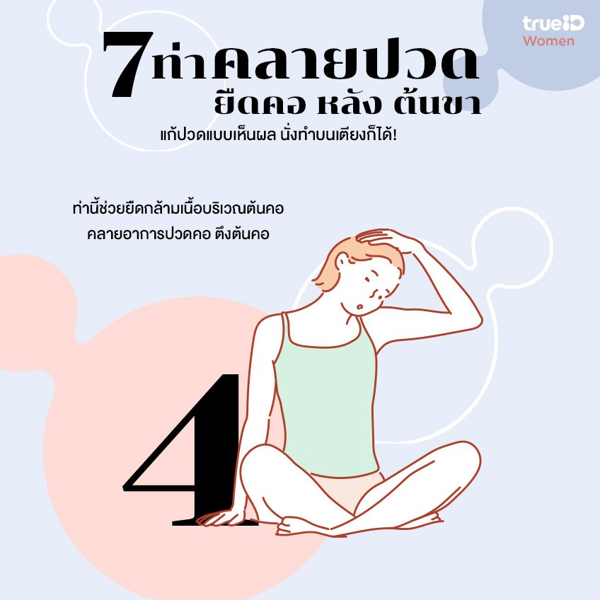 ท่านี้จะช่วยยืดกล้ามเนื้อบริเวณต้นคอและไหล่ได้ดีค่ะ ช่วยคลายอาการปวดต้นคอ ตึงต้นคอ และลดอาการตึงบริเวณบ่าและไหล่ได้