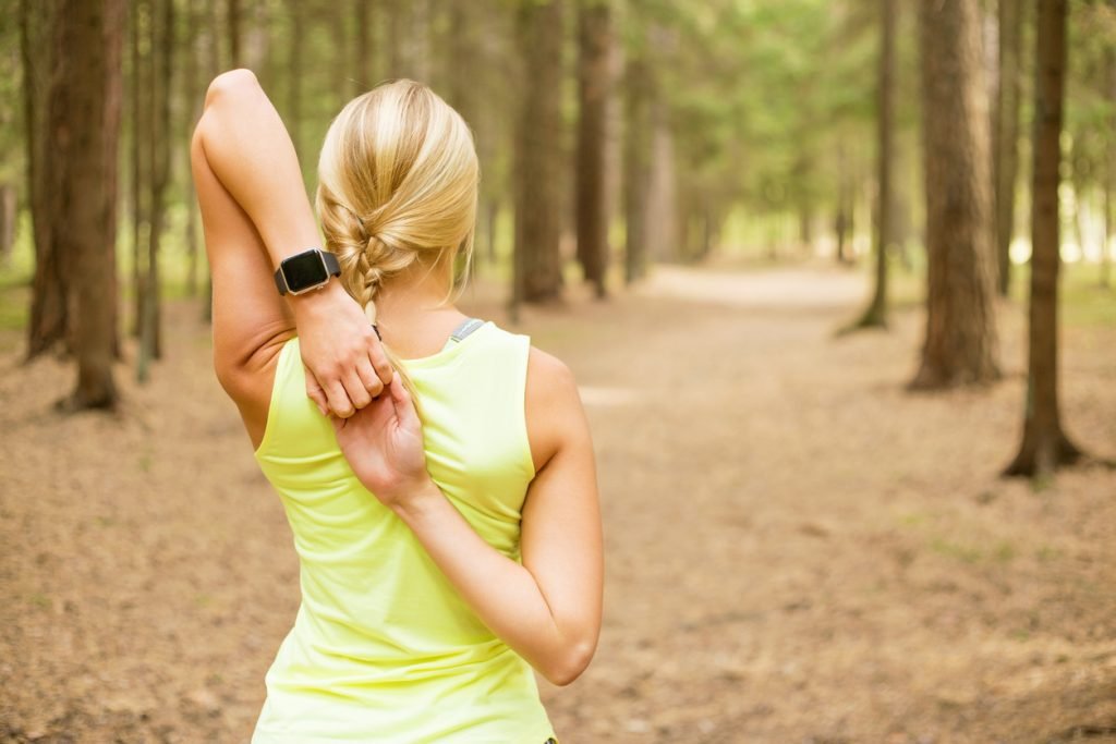 ยกมือข้างหนึ่งไปแตะบริเวณหัวไหล่ แล้วยกมืออีกข้างไปแตะที่ข้อศอก ยืดหลังตรงจากนั้นมือที่อยู่ด้านบนพยายามดันข้อศอกลงจนรู้สึกตึง ค้างไว้ประมาณ 5-10 วินาที แล้วทำสลับข้างซ้ายขวา