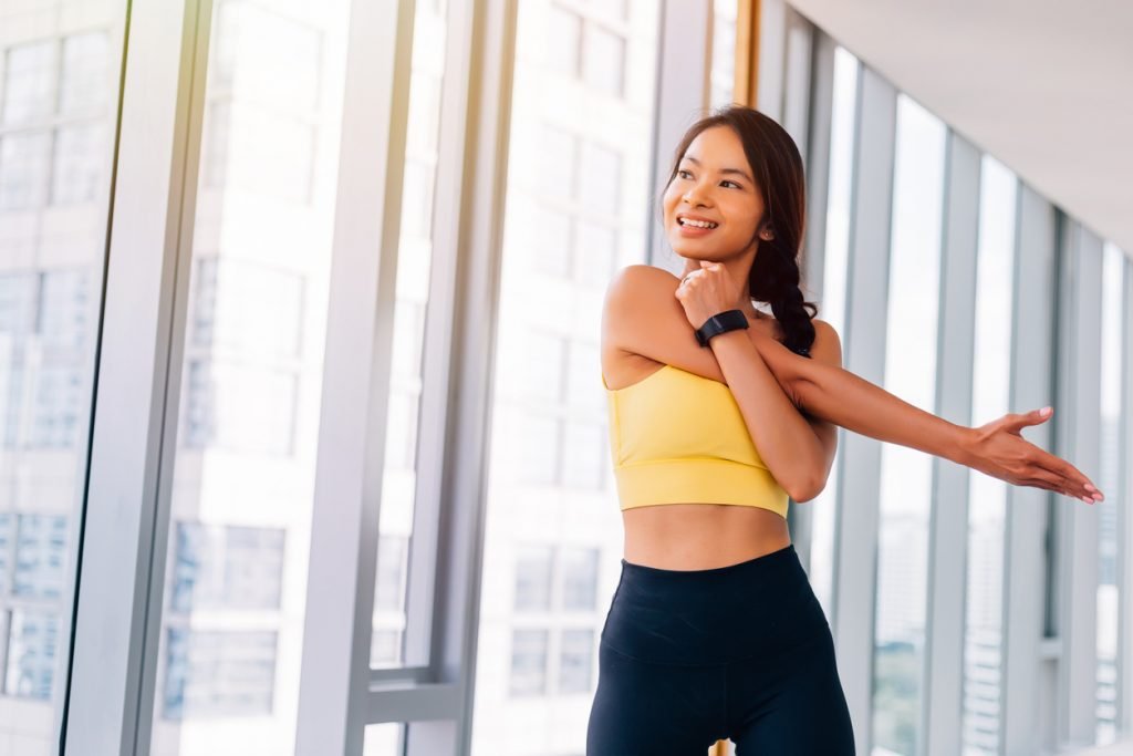 ยืดแขนข้างหนึ่งไปทางด้านข้าง แล้วใช้แขนอีกข้างพับแขนขึ้นมาหาตัว ดึงแขนให้ตึงที่สุดเพื่อยืดเส้นบริเวณหัวไหล่ ทำสลับข้างซ้ายขวา ค้างไว้ประมาณ 10-20 วินาที