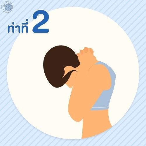 ท่าที่ 2 ท่านี้จะช่วยยืดกล้ามเนื้อบริเวณคอด้านหลัง โดยให้เอามือทั้งสองข้างประสานไว้ที่ท้ายทอย จากนั้นค่อย ๆ โน้มคอลงไปข้างหน้า ทำค้างไว้ 20 วิ ประมาณ 3 เซ็ต จะรู้สึกผ่อนคลายมากขึ้น