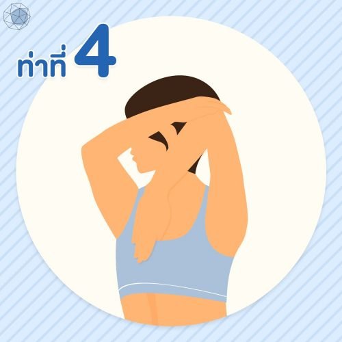 ท่าที่ 4 ท่ายืดกล้ามเนื้อบริเวณสะบักและต้นแขนด้านหลัง เริ่มจากยกแขนขวาแล้วพับศอกไปที่ด้านหลัง จากนั้นใช้แขนซ้ายจับข้อศอกขวาเอาไว้ แล้วดึงศอกขวาลงจนเริ่มตึง ทำค้างไว้ 10 วิ แล้วสลับข้าง ประมาณ 3 เซ็ต (ซ้าย + ขวานับเป็น 1 เซ็ต)