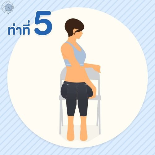 ท่าที่ 5 ท่ายืดกล้ามเนื้อบริเวณบ่าและหลัง เริ่มจากนั่งหลังตรง เอามือขวาเอื้อมไปด้านหลัง มือซ้ายจับที่เข่าขวา แล้วค่อย ๆ เอี้ยวตัวไปด้านขวาให้ช่วงสะบักตึง ทำค้างไว้ 20 วิ แล้วสลับข้าง ทำ 2-3 เซ็ตน่าจะเพียงพอแล้ว
