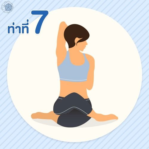 ท่าที่ 7 เป็นท่ายืดกล้ามเนื้อที่ช่วยลดอาการปวดไหล่และหลังอีกเช่นกัน เริ่มจากยกมือขวาแล้วพับไปที่ด้านหลัง แล้วเอามือซ้ายไพล่หลังแล้วเอื้อมจับมือขวาให้ถึง เมื่อยืดจนรู้สึกตึงแล้วให้ค้างไว้ 5-10 วิ จากนั้นให้สลับข้าง ทำประมาณ 3-4 เซ็ต จะค่อย ๆ หายตึง ถ้าเอื้อมไม่ถึงให้ใช้ผ้าเป็นตัวช่วย
