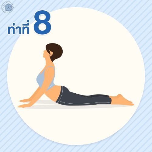ท่าที่ 8 ท่านี้เป็นท่ายืดกล้ามเนื้อแบบโยคะ แก้อาการปวดหลังได้ดี เริ่มจากนอนราบกับพื้น แล้วค่อย ๆ เอามือดันตัวขึ้น โดยให้ขาส่วนบนแตะพื้น แล้วยกสะโพกขึ้นนิดนึง เงยหน้าขึ้นเล็กน้อย ทำค้างไว้ประมาณ 10 วิ สลับกับท่าที่ 9 ประมาณ 5 เซ็ต (ท่าที่ 8 + ท่าที่ 9 > 1 รอบ = 1 เซ็ต)
