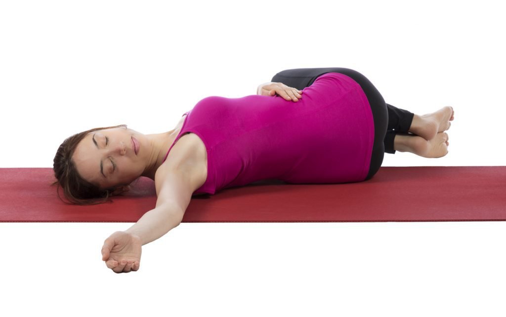 ท่านี้จะช่วยผ่อนคลายกล้ามเนื้อหลังและช่วยลดความตึงในร่างกายของคุณอีกด้วย เริ่มจากนอนหงายแล้วงอเข่า บิดขาทั้งสองข้างไปข้างใดข้างหนึ่งโดยที่ลำตัวบิดไปด้านตรงข้าม พยายามอย่ายกสะโพกหรือหลังขึ้น ทำท่านี้ค้างเป็นเวลา 2-3 นาทีแล้วสลับข้าง