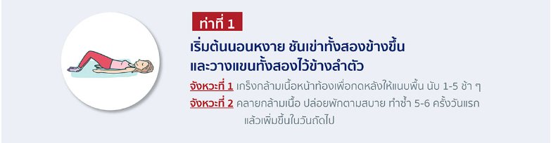 จังหวะที่ 1 เกร็งกล้ามเนื้อหน้าท้องเพื่อกดหลังให้แนบพื้น นับ 1-5 ช้า ๆ