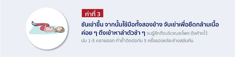 ชันเข่าทั้งสองข้างขึ้น จากนั้นใช้มือทั้งสองข้างจับเข่า ค่อย ๆ ดึงเข่าเข้าหาลำตัวช้า ๆ จนรู้สึกตึงบริเวณสะโพกเล็กน้อย โดยให้เอวและสะโพกไม่ลอยจากพื้น ดึงค้างไว้นับ 1-10 คลายออก ทำซ้ำติดต่อกัน 5 ครั้ง