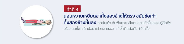 นอนหงายเหยียดขาทั้งสองข้างให้ตรง ขยับข้อเท้าทั้งสองข้างขึ้นลง กดส้นเท้ากับพื้นและเหยียดปลายเท้าขึ้นลงจนรู้สึกตึงบริเวณสะโพกเล็กน้อย แล้วคลายออก ทำซ้ำติดต่อกัน 10 ครั้ง