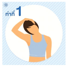 – ยกแขนขวาขึ้นมา แล้วอ้อมไปด้านข้างศรีษะ ไปจับที่ใบหูข้างซ้าย